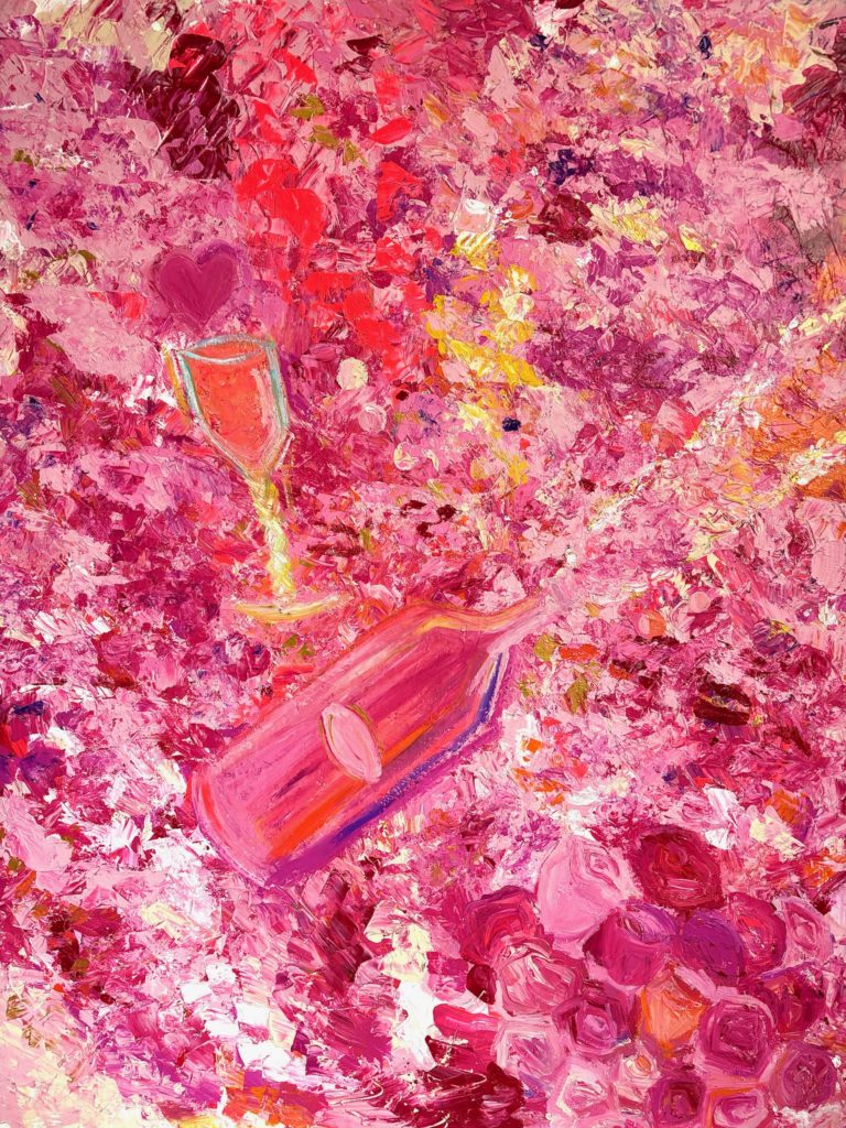 ”Des roses et du champagne” – peinture acrylique sur toile 100×81 cm (2022)
